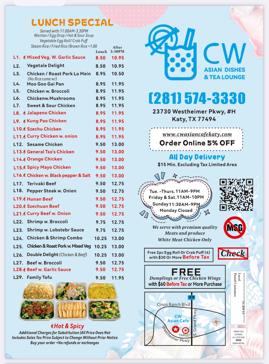 Welcome to CW Asian Cafe, located at 23730 Westheimer Pkwy H, Katy, TX. This hidden gem promises an authentic Asian culinary experience that delights both the palate and the senses. Guests rave about the sweet and sour chicken, which is a standout dish that captures the perfect balance of flavors. Reviewers consistently highlight the delicious Mango Smoothie, an invigorating treat that complements the vibrant entrees.